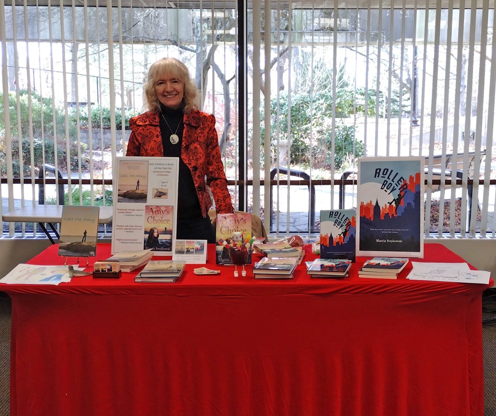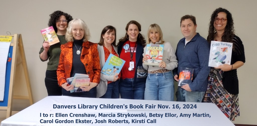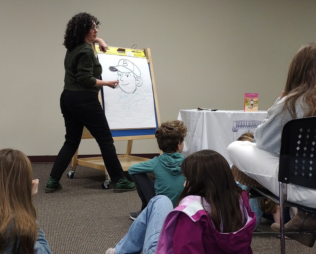 Lastly, you can create a small book fair by uniting a few different authors at the same time. Before the holiday in late November, I invited authors back who had presented before, as well as some we hadn’t worked with yet. I kept the number small to start — just 6 creators, 5 authors and one graphic novel illustrator who were available. I arranged a space with 6 tables for each creator, plus a presentation table at the front of the room. Each creator could give a presentation for 10 – 15 minutes. Graphic novel illustrator Ellen T. Crenshaw chose to draw a character from The Babysitters Club, which was a huge hit with the kids. Some authors read their picture books aloud. Josh Roberts read the first chapter of The Witches of Willow Cove aloud and held a Q+A. Marcia Strykowksi had made apple turkey crafts to give away at her table. The craft tied in with one of her books, Amy’s Choice, plus the event was held before Thanksgiving, so it was a hit!