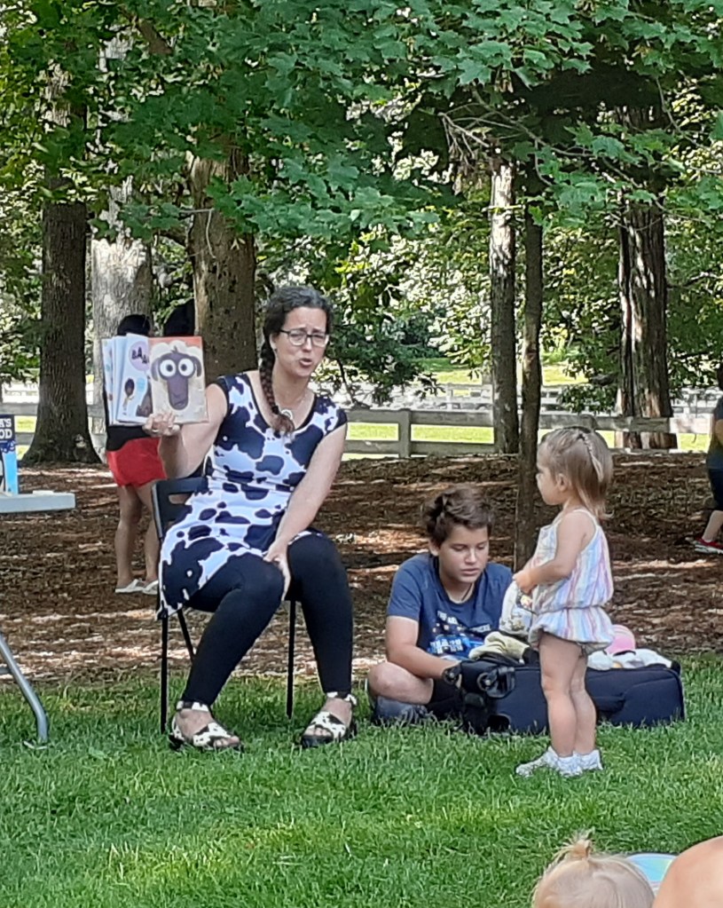 Kirsti Call’s books have a focus on farm animals. For example, Mootilda’s Bad Mood, Cow Says Meow and Cold Turkey star cows and turkeys. For this event, I coordinated with a local park which has farm animals. We held the event there, under some beautiful shade trees. Kirsti read her funny stories while her son accompanied her with animal puppets and her daughter played guitar. She read her books aloud, and we all made farm animal sounds! A crowd of preschoolers and their parents all sang along. After reading, she invited the kids to come to her table for a free sticker, which is a great idea. Even those who are on a tight budget can enjoy the program and walk away with a sticker and some great memories. Kirsti then signed books for those who were interested, chatting with the audience and making great connections. Kids could then enjoy the rest of their morning at the park, having a picnic or meeting the animals.