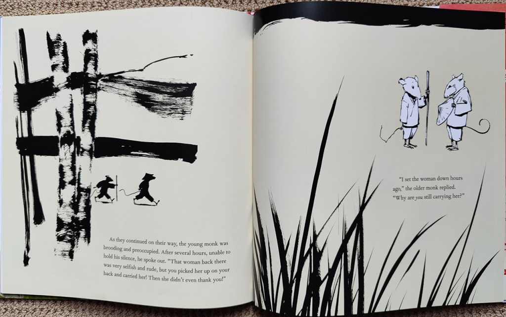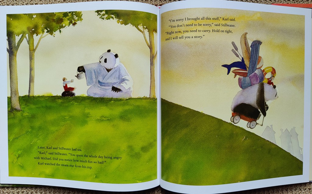 While siblings Michael, Addie, and young Karl come to know their neighbor Stillwater, who speaks with a hint of “panda accent,” he tells them three stories based on Zen and Taoist thought that show the children other ways of thinking. The narrative is reinforced by confident watercolors for the spreads with the children and Stillwater, while the three tales are rendered in Japanese shodo-style brushwork in ink on solid backgrounds. Text and paintings work together to convey simple intimacy and thoughtful emotions.