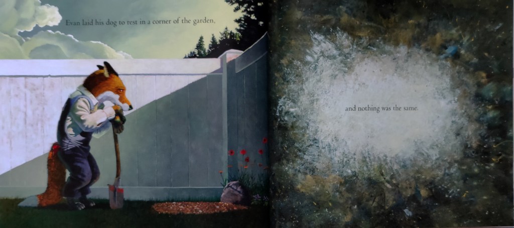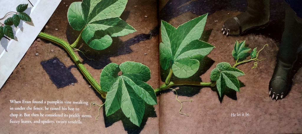 “But one day, the unthinkable happened.” Evan’s angry, despairing response to the death of his beloved friend might seem familiar to children and authors alike. So, how should one cope with personal tragedy? Evan’s response is to take it out on the garden, hacking away at it and encouraging spiky, thorny weeds to grow. Yet, his attachment to the garden is what turns the story arc toward a satisfying message of hope, and a new beginning – a puppy. When everything seems in ruins, leaning into your core beliefs will turn things around.