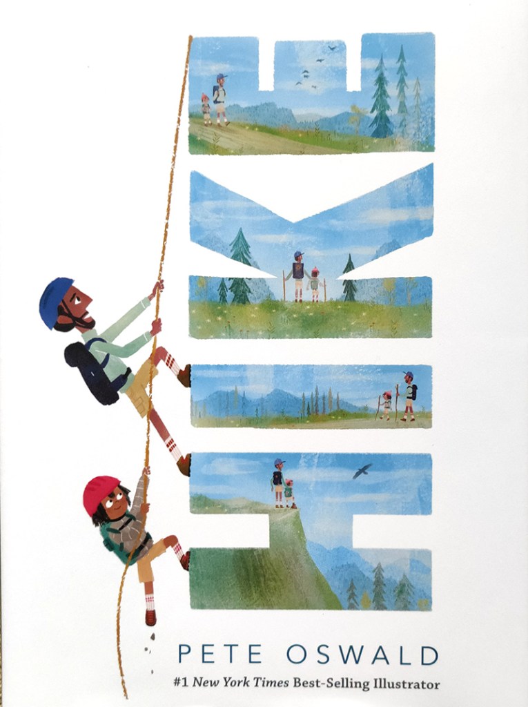 In Hike, a father and child gear up and head from the city suburbs into a mountainous forest. Along the way, they observe birds, butterflies, and bear tracks, taking notes and using equipment they brought. The nearly wordless story shows the two having a snowball fight and watching fish in a tarn before encountering an obstacle. At the foot of a waterfall, a log spans a stream they must cross. The child is worried, but Dad encourages, and fear is overcome. The intrepid explorers climb a rocky face to the mountaintop. They unpack a tree seedling they brought, plant it, and record the moment with a photograph. After retracing their journey, the story ends with a satisfying evening at home, cherishing the photographic record of their experiences outdoors. Pete Oswald lives in Los Angeles, California, and doubtless has taken his four sons into the wilds to experience the joys of and respect for the natural world that sustains us.
