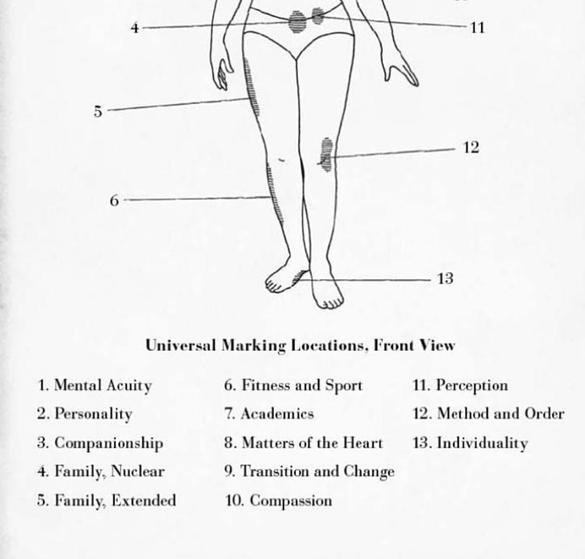 The bible in this world is called “Mapping the Future: An Interpretive Guide to Women and Girls,” and its influence is heightened by images and excerpts from the guide displayed at the beginning of each chapter. Not only does it show what markings (freckles, moles, birthmarks) mean in various locations along the female body, it also delineates the laws. The accepted (and creepy as all get out) ritual is that fathers are the first to view the adult markings of their daughters. Only two genders are acknowledged, and only male-female relationships are sanctioned. Furthermore and quite chillingly, if a young woman is kidnapped during her transition period (roughly two weeks), it is deemed her fault and her future prospects are ruined. Most are ostracized by classmates, and families, especially fathers, have difficulty accepting “ruined” daughters back into the fold.