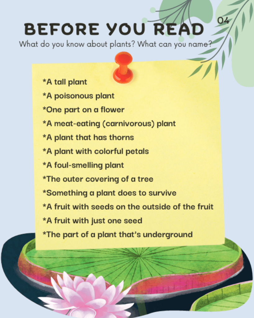 So, where to start? Both an author and an educator work to draw students in. An educator’s guide needs to begin where kids are at. I always include a ‘Before you Read’ section. In my guide for Fantastic Flora: the World’s Biggest, Baddest, and Smelliest Plants, I provide a list for students to demonstrate what they already know about plants. Can they name a plant with thorns? Can they name something a plant does to survive? The list gets learners thinking and initiates curiosity for the topic. Now, what’s next to encourage readers to dig deeper? (See what I did there?)