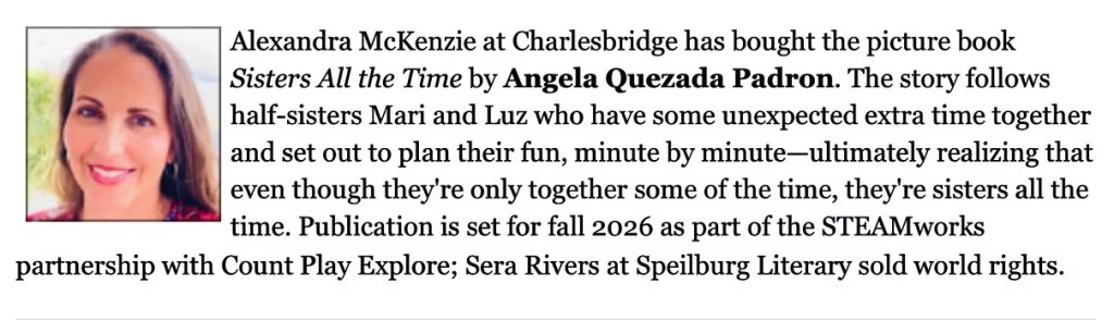 Many years ago, I wrote a picture book called HALF LAUGHS about two half siblings who share the same dad and love to spend each weekend together. However, they’re sad when the older sister has to leave to go back to her home. It was based on the fact that I have several half siblings with whom I share the same dad, and my son and stepsons share a father. I tried different ways to make the story work (even putting it in rhyme at one point), but I could never make the premise strong enough to get interest from a publisher. In 2024, my agent submitted the story to Charlesbridge and low and behold, an editor who critiqued the story at a NJSCBWI conference in 2015 was reading it! She remembered it and asked if I could convert it into a STEAM story (one that infuses science, technology, engineering, art, or math) for their STEAMworks line of books. We went back and forth about four times. I changed the plot of the story completely to make it that the sisters only have two hours left to spend time together, and they’ll use estimation to brainstorm what to do. BUT the main point of the book stayed original, that two sisters can love each other all the time no matter if they’re together or apart. SISTERS ALL THE TIME comes out with Charlesbridge in fall 2026! So my advice is to be open to ideas to change your story but always remember to keep the main idea and heart of the story where you want it to be.