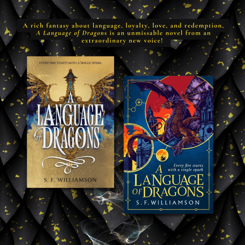 Yes, I have a weakness for dragon books, especially those that portray dragons as creatures capable of intelligent thought and compassion. I’m definitely the kind of person who would go up to one and try to strike up a conversation, if the chance ever presented itself in the scaly, fire-breathing flesh. It’s no wonder this novel grabbed me, but I can honestly say that it exceeded my expectations by far. I’m thrilled to introduce A Language of Dragons, a debut novel by S. F. Williamson, to all of you!