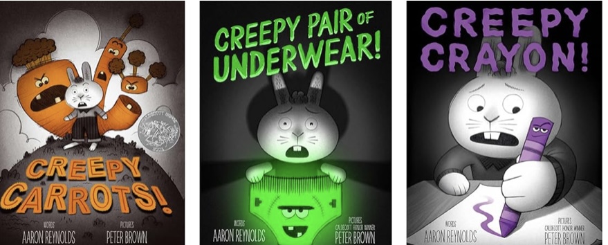 In Creepy Carrots!, Jasper Rabbit becomes convinced that the carrots he loves to eat are following him. Then, in Creepy Pair of Underwear!, his glowing green underwear appears to have a mind of its own. Finally, in Creepy Crayon!, a purple crayon refuses to be discarded and keeps reappearing when Jasper least expects it.