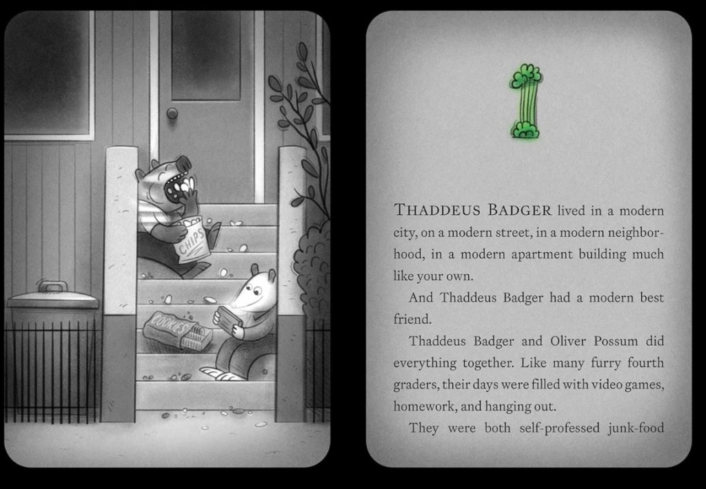 Unsettling Salad!, coming out next month, shifts gears. Reynolds introduces Thaddeus Badger, a character who believes deeply in science, logic, and explainable phenomena. He trusts that the world makes sense—which makes him the perfect protagonist for a creepy story. He and his friend Oliver Possum are self-professed “junk food junkies” with a particular hankering for their favorite burger joint and an aversion to vegetables and health food. Things take a supernatural and unsettling turn when Oliver eats a salad (at the behest of his well-meaning parents) and the salad fights back!