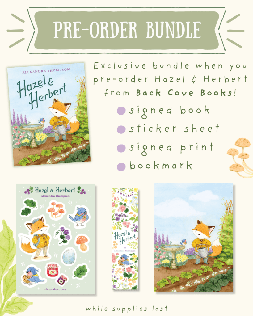 AT: In addition to the usual social media postings and newsletter outreach, I have an amazing pre-order bundle that I’m doing with Back Cove Books in Portland, Maine. When you pre-order your copy through them, you’ll receive a signed copy of the book, sticker sheet, bookmark, and signed art print. I’m so excited with how the book swag came out! You can pre-order here: https://backcovebooks.com/hazel-herbert