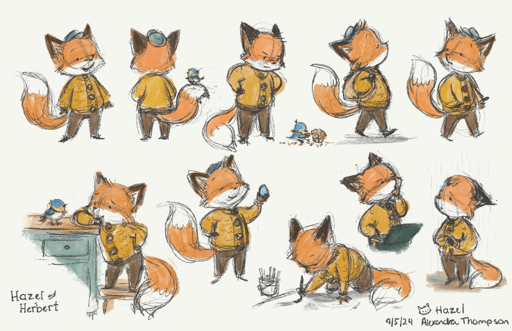 Alexandra Thompson (AT): Yes, I’m so excited for this book to come out! Hazel & Herbert is the story of a young fox, Hazel, who discovers an egg while out on a walk. She’s excited to get home and cook up the egg with her Papa when much to her surprise — TIP, TIP, TAP! — out pops a baby bird. Her life is upended by this sudden new addition and the book explores the rich social-emotional concepts of the inevitability of making mistakes, forgiveness, and found family.
