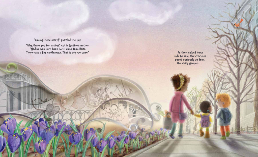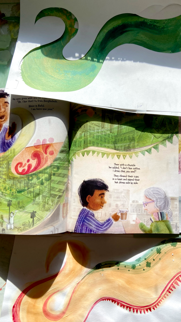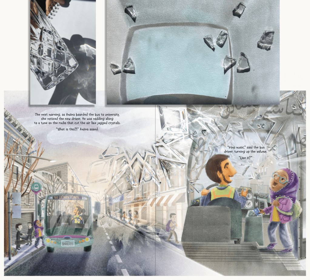 Luciana: I’m so happy you noticed because I spent a lot of time on them! These “memory ribbons” are in a different physical plain than the rest of the “current moment” illustrations – in the past, being recalled. The memory ribbons were illustrated using swirls of paper cut ribbons that I scanned to get the tri-dimensional effect. I illustrated them using a variety of elements to represent each place – the bus driver Muhsin remembers teaching in Iraq, so part of his memories are the gorgeous intricate hexagonal patterns that you see in Islamic art, for example. For Nadine’s Creole language and memory ribbons, I found a magnolia flower specific to Haiti – I used paper quilling to create shapes of flowers, and I used it to give dimension to her memories as well. And the ribbons all have a main color scheme evocative of each place. It was one of my most challenging books to illustrate, but I hope the readers get immersed in it like you did – that is always my intent with every title. I am attaching some images that show the process in this email.