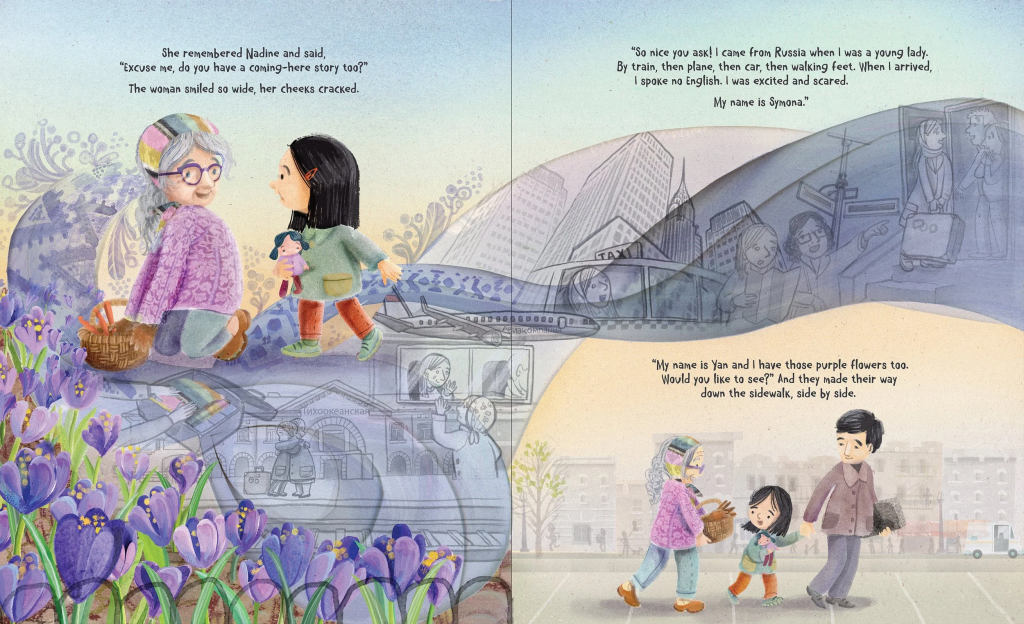 When Nadine asks a new friend if she has a coming-here story too, she topples the first domino in a community-wide chain of neighbors and new friends listening to those around them, wondering about their perspectives, and finally asking thoughtful, curious questions. This lyrical, pay-it-forward story encourages readers to engage with those around them, seeing each similarity and difference as part of the colorful landscape of community.