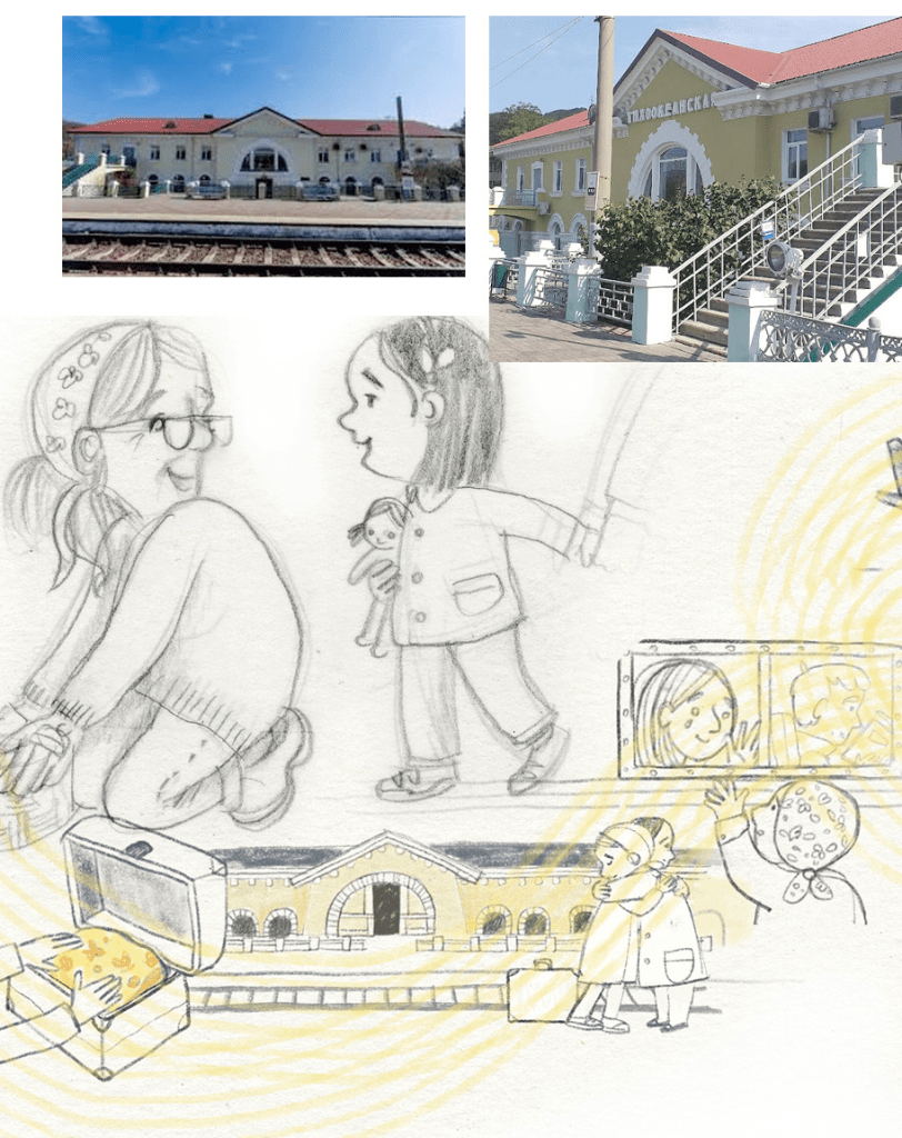 My research included talking to people from some of the cultures and asking for very specific references. For the Russian character, Symona, for example, I talked to a young lady that lives in my town. She emigrated to the US from the Soviet Union as a child and provided me with wonderful photos of her family that I used as inspiration for Symona’s memory ribbon – including the train station from her hometown, the patterns of fabric, the Russian song about Spring that Symona sings while gardening. Pencils are where all the real thinking about the story happens, and we had a few rounds of approvals until the whole team was on board. Final art stage goes very smoothly after that, and I had a lot of fun playing with different elements to build the memory ribbons and the language, trying to make them as evocative as Elly’s poetic text. At the deli, for example, when Symona steps in to get coffee and hears “words like jewels that bounced and danced through the isles” – I used actual costume jewels mixed with sparkly silver resin, then scanned it and incorporated in the illustration. I rendered all the languages using volume and real objects – actual glass shards, paper quilling, cut paper – to try to portray language as living entities.
