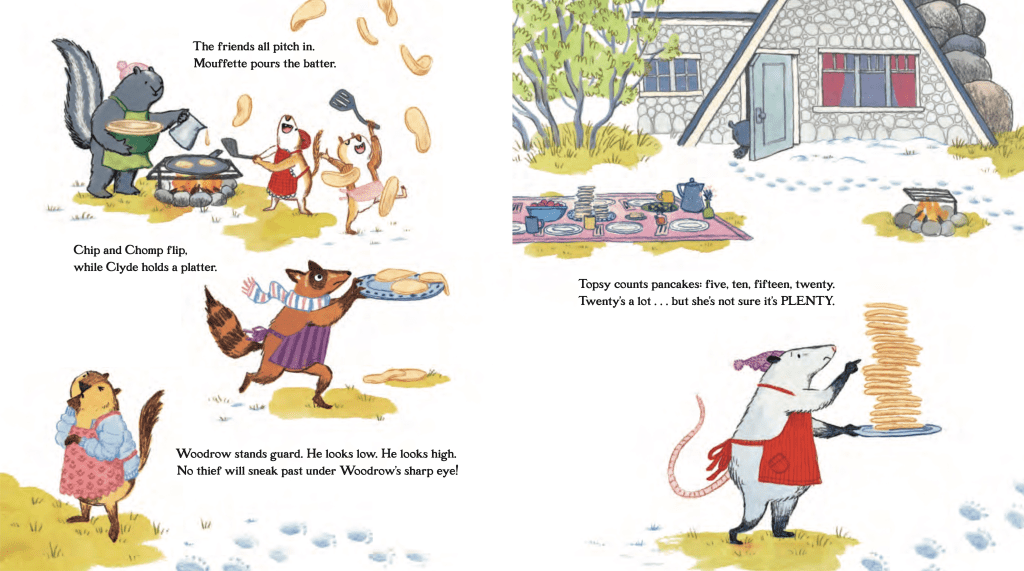 Laura: The back cover shows LouAnn and other characters holding towering plates of pancakes, with this message: “Pancakes are better shared.” Within the story, Topsy makes pancakes in batches of five. Can you share more about those two elements, the sharing theme and the sprinkling in of math?