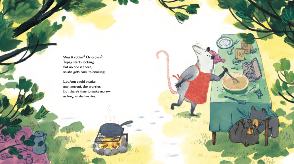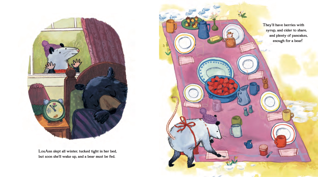 Laura: Now to discuss the adorable characters! How did you choose Topsy the opossum for the lead role, and wait: how about those pancake thieves?!? MUNCH MUNCH MUNCH!! I adore how Brianne hid the thieves and slowly revealed them. Was that based on your direction (illustrator notes) or her own creativity? FYI: I actually learned an incredibly cool tidbit about hibernating bears from this book, and I know your readers will be amazed to discover it themselves.