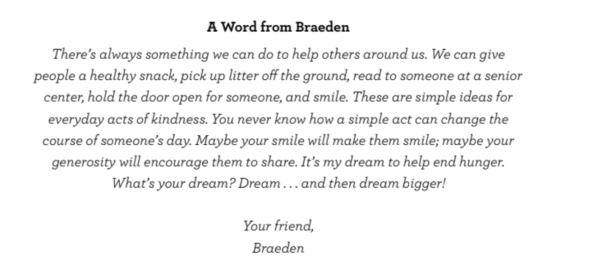 Just One Pebble is the inspirational story of how nine-year-old Braeden Mannering started a non-profit organization called Brae’s Brown Bags in an effort to end hunger. Dianna Wilson Sirkovski came across Braedan’s story on (link to website) and says, “The story reached out and wrapped its fingers around my heart.”